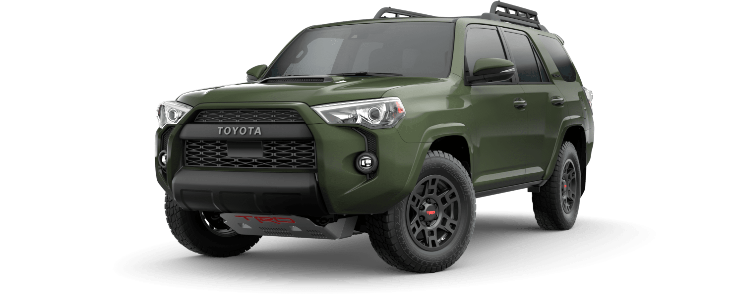 The Army Green 2020 4Runner TRD is exactly what it looks like. It's big, tough, and thoroughly capable of performing on rugged terrain and in difficult conditions. This years top trim includes: standard four-wheel drive, tires with wider grip, a new Crawl Control, a KDSS suspension upgrade, a large roof rack, and LED foglights, to name a few. The 4Runner gets its power from its 270-horsepower 4.0-liter V-6 making 278 pound-feet of torque, and a five-speed automatic transmission.