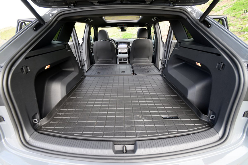 For cargo carrying purposes, you simply can't beat the Atlas Cross Sport for size, convenience or ease of stowage. Dropping the second row bench seat back required two simple lever flips, and voila, you have converted the interior from its already generous 40.3 cubic feet of storage (behind row 2) to a truck-like 77.8 cubic feet with the row 2 seats flat. VW equipped our Atlas with a $235 set of "Monster Mats." This option consisted of 4 utilitarian looking logo floor mats plus a heavy duty two piece trunk liner. This latter item, called "MuddyBuddy by WeatherTech," was studded with non-slip "VW CarGo Blocks." Of all the SUVs I have test loaded with a bicycle, this VW was by far the easiest to accomplish. The rear gate opens and closes automatically, the liftover threshold is almost minivan low, and the amount of flat, unobstructed floor space is simply enormous. The Monster Mat trunk liner grips and stabilizes the load without need to tie anything down.