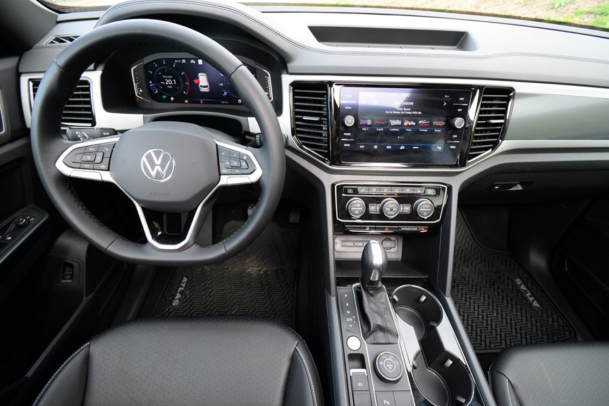 Still, there is no arguing that our test model, painted $395 optional Pure Grey, looked much more purposeful than the standard boxy Atlas. With a pleasing fluidity to its sloping roofline, the Cross Sport sits 2.2 inches lower and 5.2 inches shorter than the 3-row Atlas. The Cross Sport is available with either a 2.0 liter turbocharged 4 (235hp) or a 3.6 liter V6 (276hp). We tested the top line SEL version of the 4 cylinder turbo. This model, which includes VW's 4Motion all-wheel-drive, as well as a digital cockpit and panoramic sunroof, retails for a base price of $41,445. If you opt for the V6 Cross Sport, the base price is $44,190.