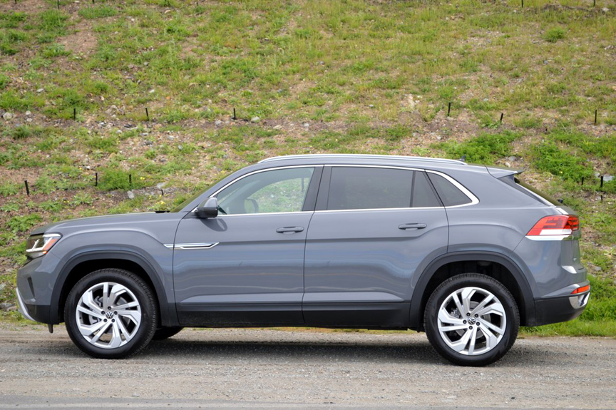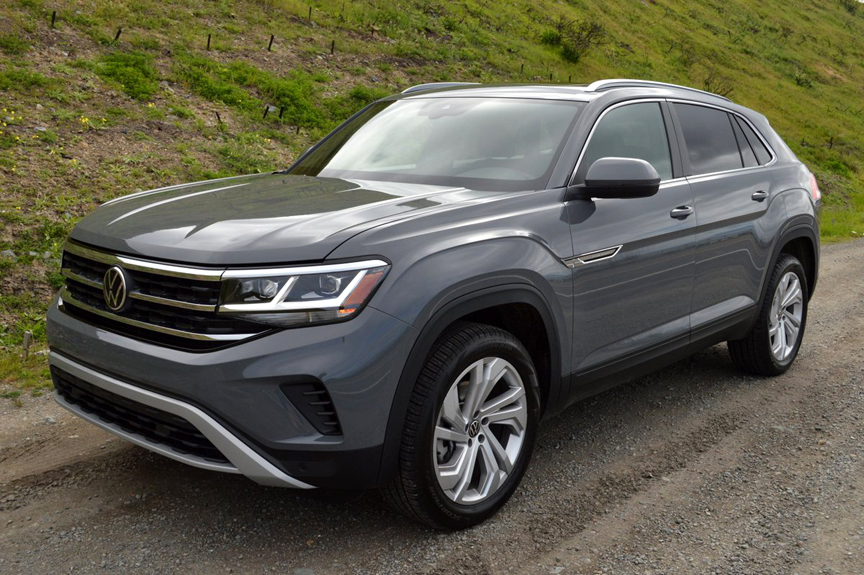 Attenuated rooflines on SUVs are all the rage in Germany these days. BMW started the craze with their preposterous looking X6, which combined the body of a brute with the head of a pea to create an SUV "coupe" that looks like Bluto. Thankfully, VW's designers have done a much better job in converting their 7 seat, 3-row Atlas into the 5 seat, 2-row Atlas Cross Sport. The debut of the new Cross Sport was preceded by VW showcasing their foxy looking Atlas Basecamp Concept at world-wide auto shows. While the Concept version sported such notable attributes as matte black alloy rims with spike-treaded all terrain T/A rubber, armored body cladding, matte black hood and matching tubular running boards, the production version of the Crossover is rather more sedate than the Basecamp Concept.