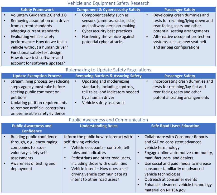 NHTSA is taking an agency-wide approach to ensuring the safe deployment of self-driving vehicles. Our activities can be categorized into three main areas: research, rulemaking and communications.