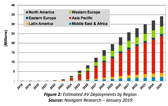 A variety of technological hurdles must be overcome before these types of vehicles could be available for sale in the United States. NHTSA is committed to supporting the innovators who are developing these types of vehicles to ensure their safe testing and deployment before they are available to consumers. Figure 2 shows a recent estimate on deployment rates worldwide.