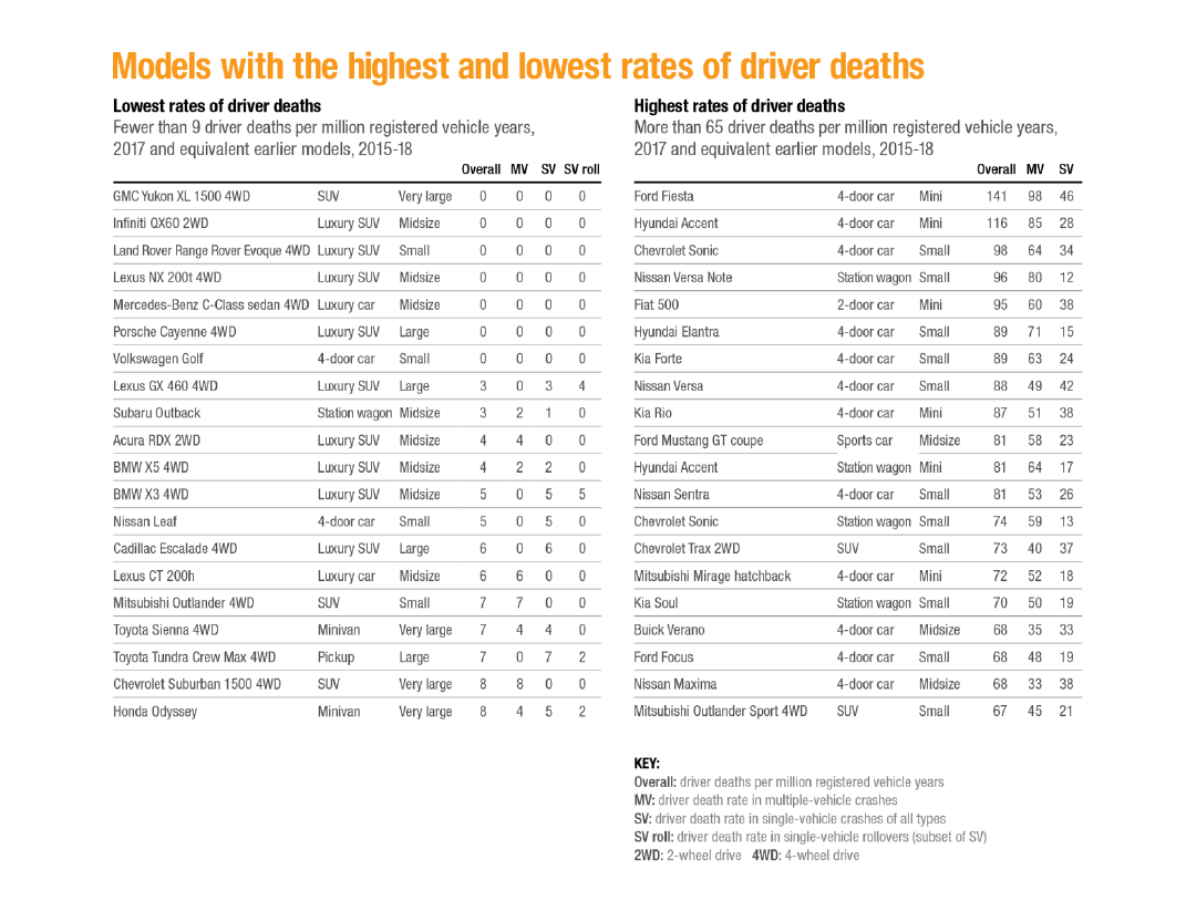 The average driver death rate for all 2017 models increased to 36 deaths, compared with 30 for 2014 models. That’s a further increase from a low of 28 for 2011 models following a steady decline since the 1970s. The rise is consistent with a larger number of U.S. traffic fatalities over the four-year period covered by this study, compared with the previous one. From 2015 to 2018 there were 147,324 fatalities, compared with 134,905 from 2012 to 2015.