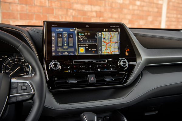 The Tech. 2020 Highlander Hybrid comes standard with a road sign detection, lane departure warning, rear view camera, forward collision warning, lane keep assist, blind spot monitoring, automatic emergency braking, cyclist and pedestrian detection, adaptive cruise control, rear cross traffic alert, and automatic high-beam headlights. The wide screen touchscreen display (looking a lot like the Space X Dragon capsule) with multi window displays is feature-filled and customizable.