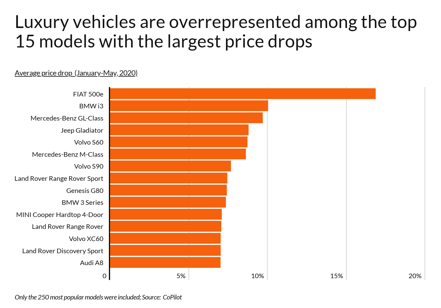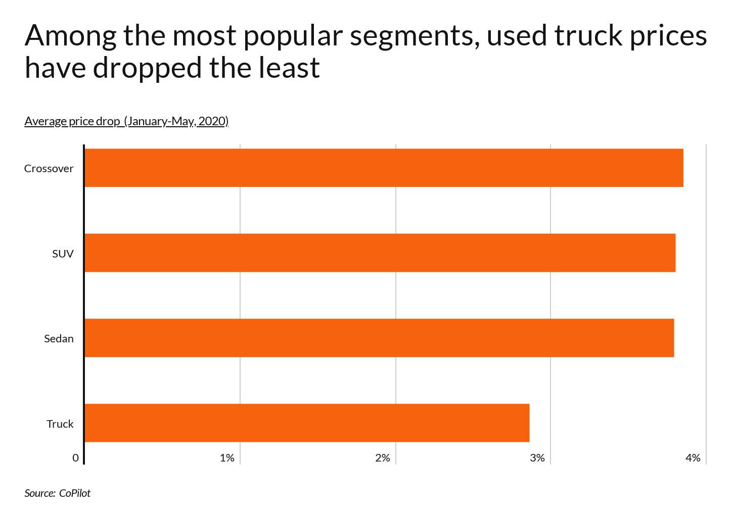 Research from automotive research firm Manheim shows that in response to reduced demand, wholesale prices (what dealers pay to buy the used cars they sell) experienced a more than 11 percent drop in April. However, the drop in wholesale used car prices has not fully hit the retail market—at least not yet. According to analysis from CoPilot, which aggregates car listings data in real-time across 46,000 U.S. dealers, retail prices for pre-owned vehicles only fell 3.9 percent nationwide between January and May 2020.