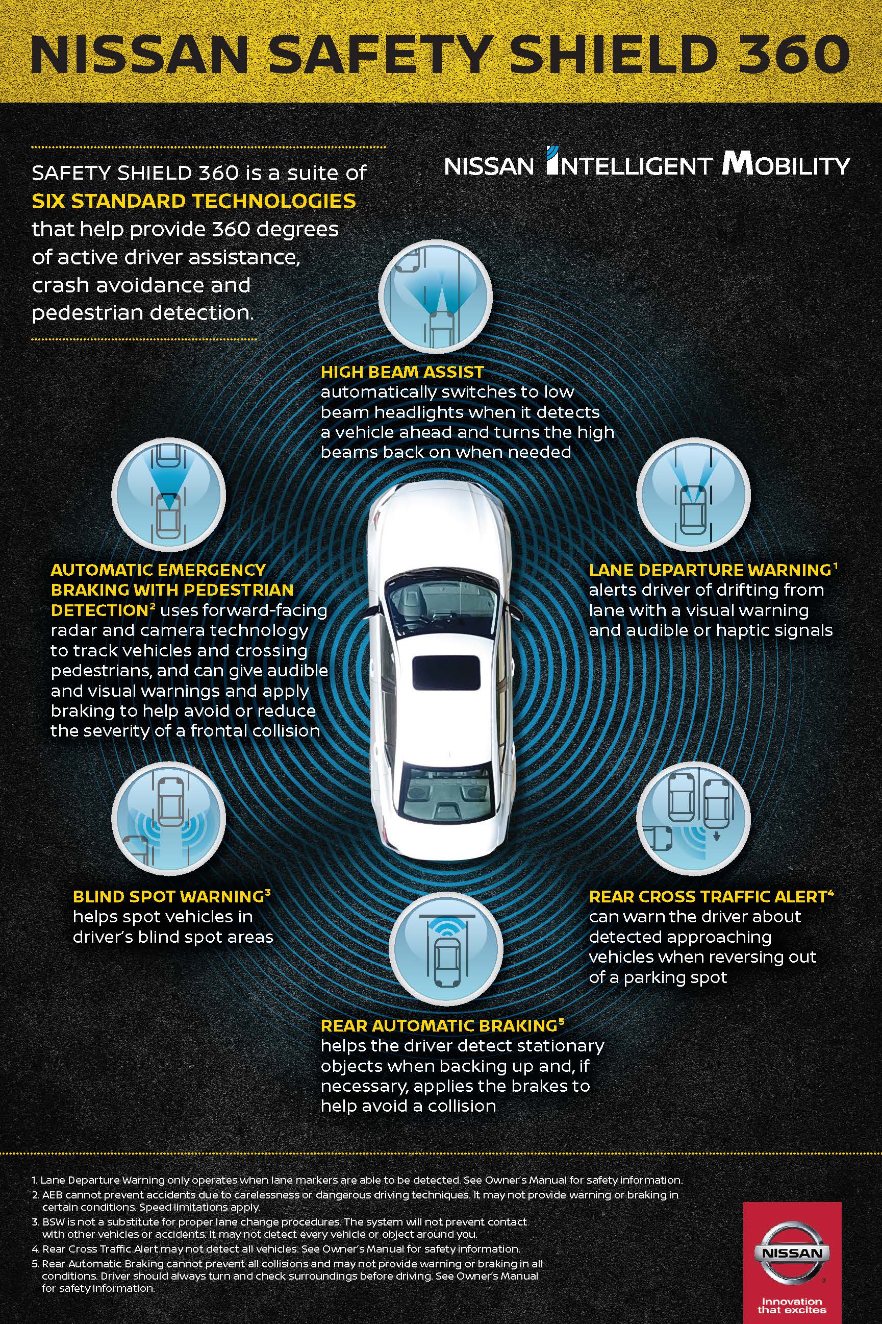 - Nissan Safety Shield technologies can't prevent all collisions or warn in all situations. See Owner's Manual for safety information.