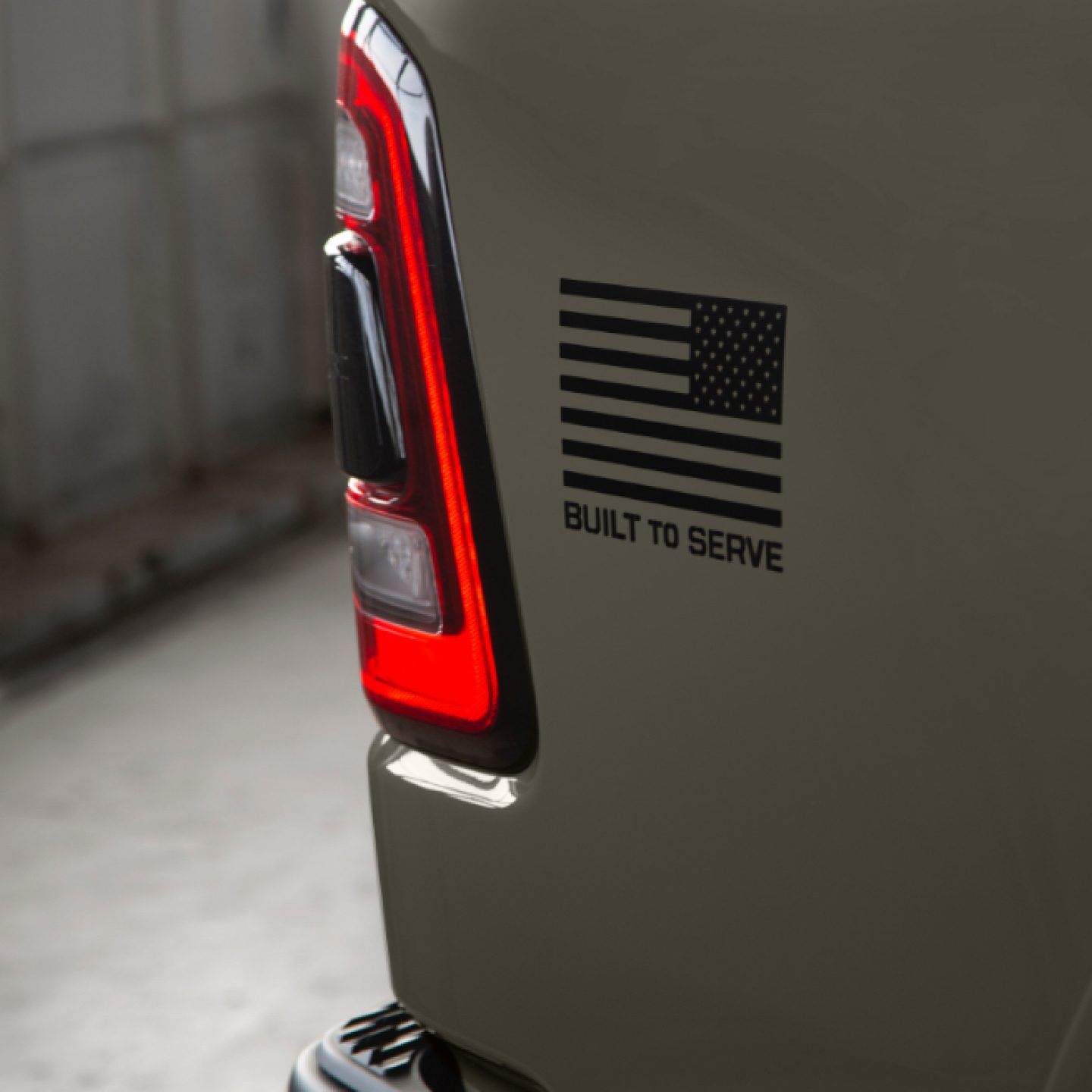 Ram "Built to Serve Edition" trucks feature other unique interior and exterior features that set them apart, including a United States flag and "Built to Serve" decal on each of the rear quarter panels.