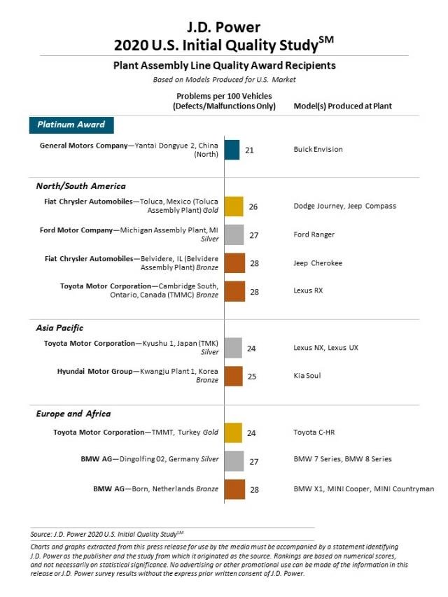 General Motors Company‘s Yantai Dongyue 2 (China) plant, which produces the Buick Envision, receives the Platinum Plant Quality Award for producing vehicles with the fewest defects or malfunctions. Plant quality awards are based solely on defects and malfunctions and exclude design-related problems.