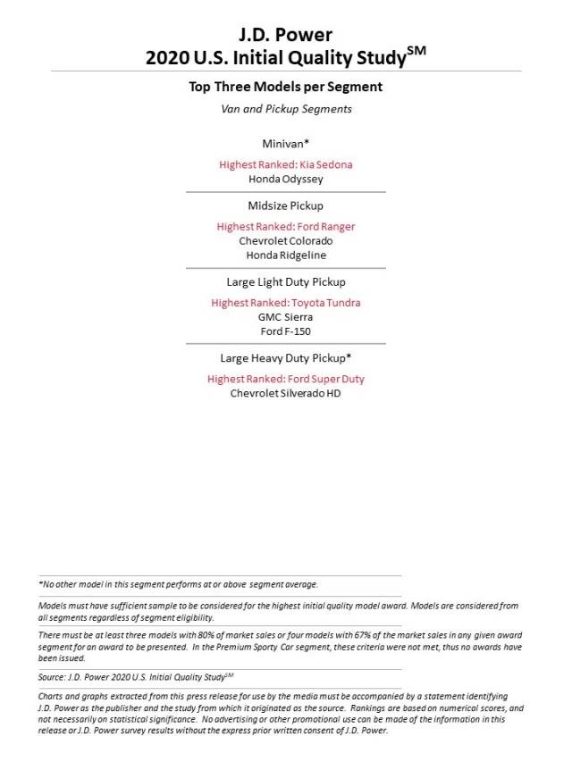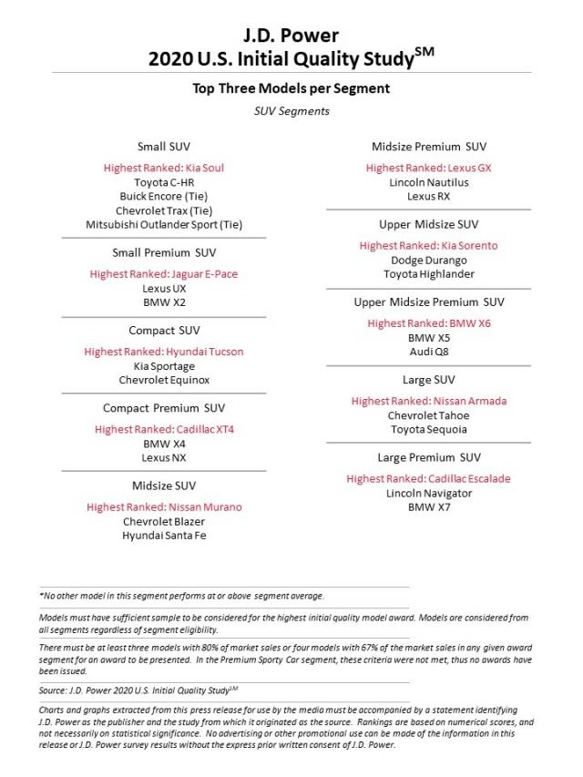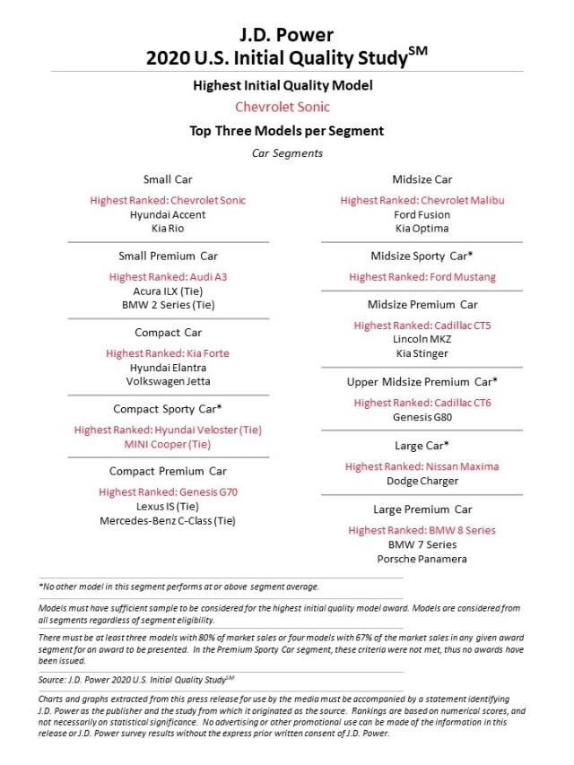 The study, now in its 34th year, examines problems experienced by owners of new 2020 model-year vehicles during the first 90 days of ownership. Initial quality is determined by the number of problems experienced per 100 vehicles (PP100), with a lower score reflecting higher quality.