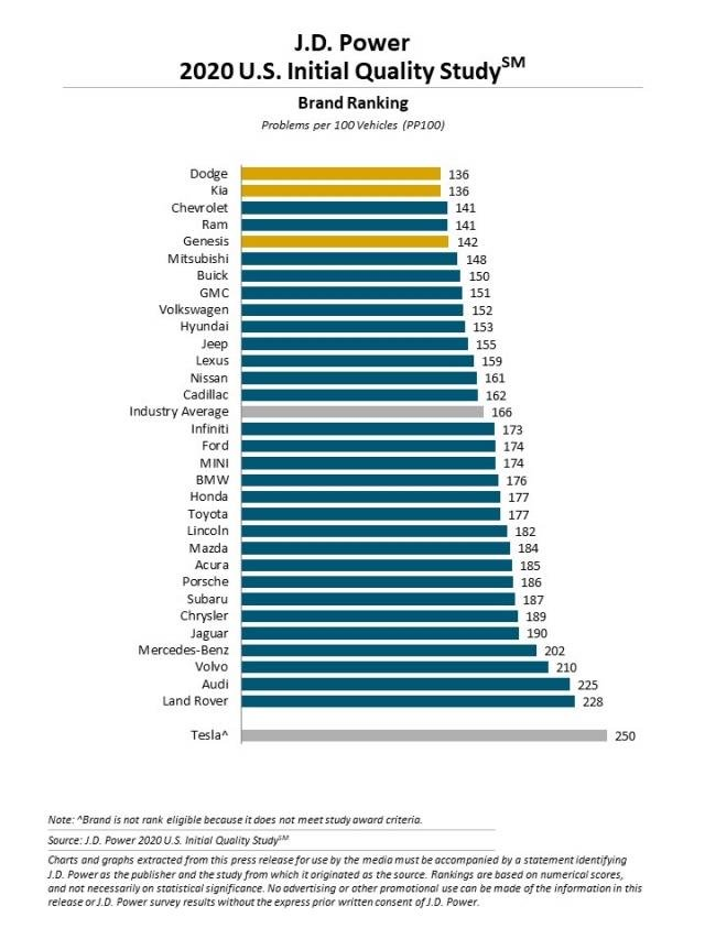 Dodge and Kia Rank Highest in a Tie for Overall Initial Quality; Genesis Ranks Highest among Premium Brands; Tesla Profiled for First Time