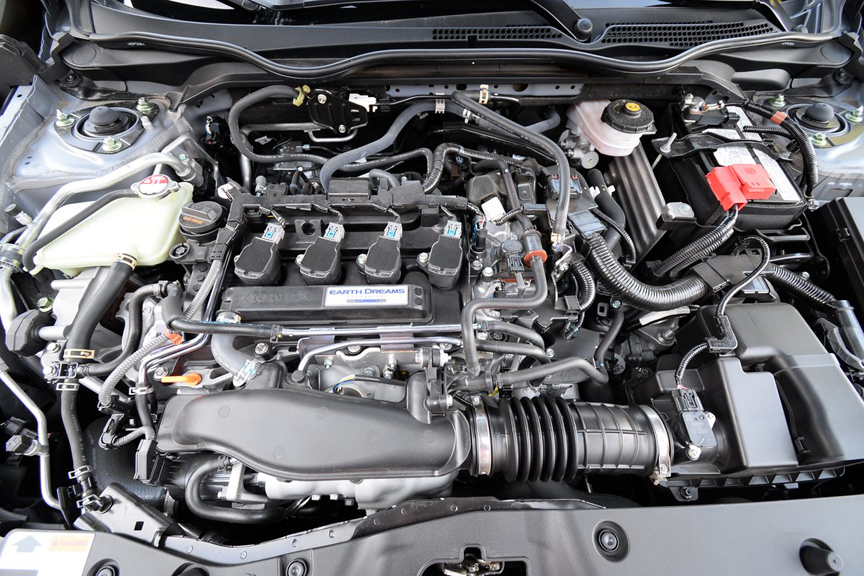 Although our test Civic was fitted with a CVT automatic transmission, you can up your driving fun and involvement by ordering yours with an available 6-speed manual. The 6-speed also saves 67lbs. of curb weight over the CVT. The Sport’s 1.5 liter, 4-cylinder turbocharged motor makes 180hp and 162lb.-ft. of torque. If you opt for the manual gearbox, torque output of the engine jumps to 177lb.-ft. Honda sees no need to encapsulate their handsome power plant with a molded dust cover, so you can see and service everything in the engine bay without having to remove any beauty screens. Since the turbo makes its peak horsepower at a rather lofty 6,000rpm, it proved handy to regulate its output with the paddle shifts. If you plant the console mounted stick in the “S” setting, the paddles allow you to assume control of your shift points. We especially appreciated the fact that in “S,” the transmission did not automatically upshift to the next higher gear without authorization from the driver.