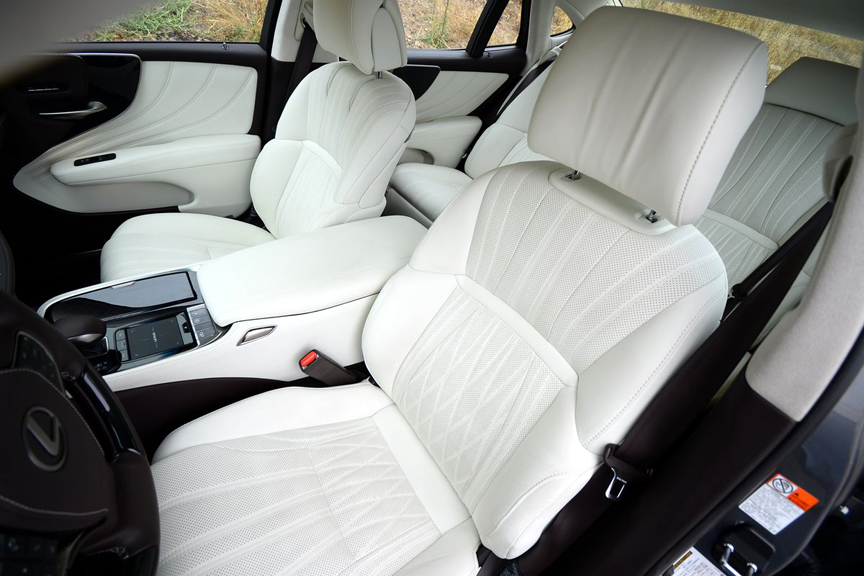 Topping the nicety list is the astoundingly expensive $17,100 Executive Package. Here's what you get: quilted-stitch, perforated semi- aniline leather interior trim that looks spectacular in bright white. The matching headliner is crafted from ultrasuede. The driver receives a 28-way adjustable power seat with multifunction massage. Front seat buckles are fitted with powered receptacles. Heated rear seats tilt outward when the rear doors are opened to facilitate ingress. The outboard rear seats feature power reclining, and power sunshades are fitted to both rear doors as well as the back window. Four zone climate control insures that all quadrants of the cabin remain privately configured for temperature. A 7 inch rear touchscreen controller located in the retractable rear armrest allows aft passengers to control their environment to the most minute detail. The Executive Package, while admittedly pricey, adds an aura of exclusivity, beauty and functionality to the LS 500 that is nothing short of palatial.