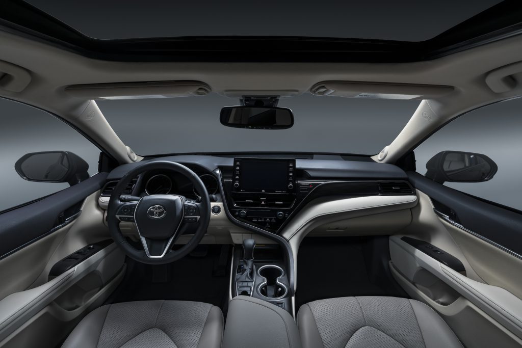 The Camry’s interior melds functionality, elegant styling, and impeccable craftsmanship. The dash design gives the driver a sporty cockpit-type feel while treating both the driver and the front passenger to expansive outward visibility. A sweeping character line flows down from the instrument cluster and bisects the center console waterfall.