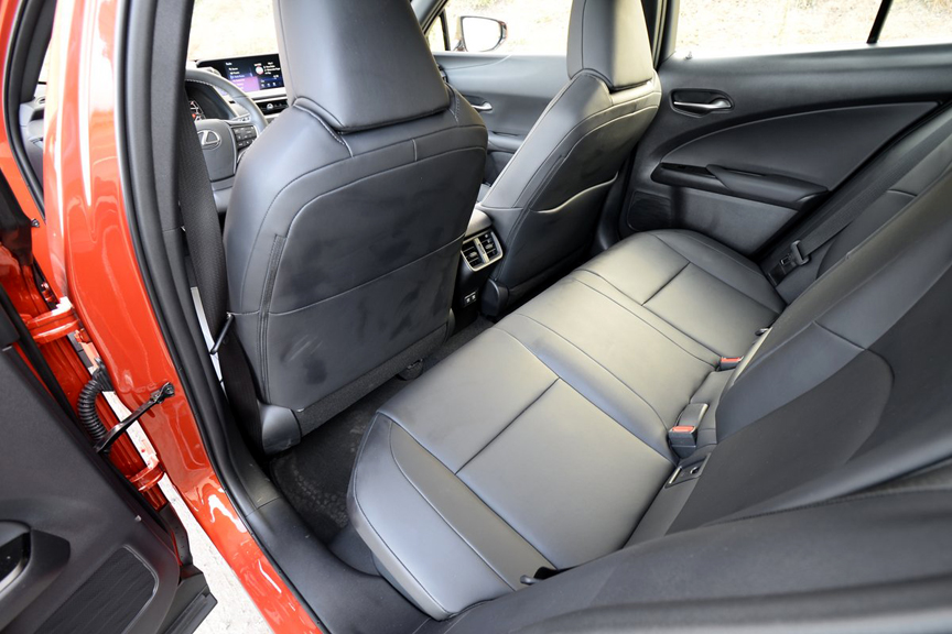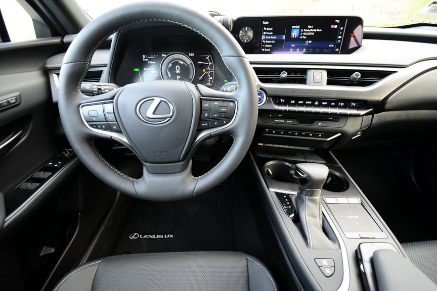 Inside, the UX Luxury model offers a stark contrast between the front and rear seat experience. Up front, the seats are cosseting and well provisioned. The driver's seat offers 10 adjustment modes plus 2 stages of lumbar support, while the passenger seat is 8-way adjustable. Both fronts are heated and ventilated, and the steering wheel is heated for an up-charge of $150. That wheel is really well designed, with a cushy and compliant rim and 14 different controls embedded within its horizontal spokes. The dash top is well manicured, with a nicely inset 7" color panel providing all the information you could ever need about your infotainment system. To control all other important HVAC functions, Lexus has provided a double row of rocker-type switches that are a welcome advance over distracting menu-based offerings that are all the rage these days. We especially liked the way Lexus matched the height of the display panel to the height of the instrument binnacle. This clever integration of surfaces avoids the "drive-in movie screen" look so common to most contemporary dashboards Unfortunately, all that good planning doesn't extend to the back seat, which proved tight, confining and uncomfortable.