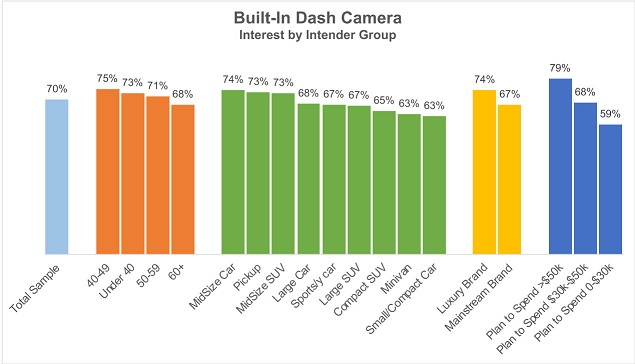 With strong demand from both luxury brand and mainstream brand intenders, the biggest differentiator for dash camera applicability is in vehicle price. Those who plan to spend greater than $50,000 on their next vehicle have the highest demand, though demand from respondents planning to spend $30,000 or less is still strong at 59%, making this a feature that could be offered industry-wide as standard or optional equipment.