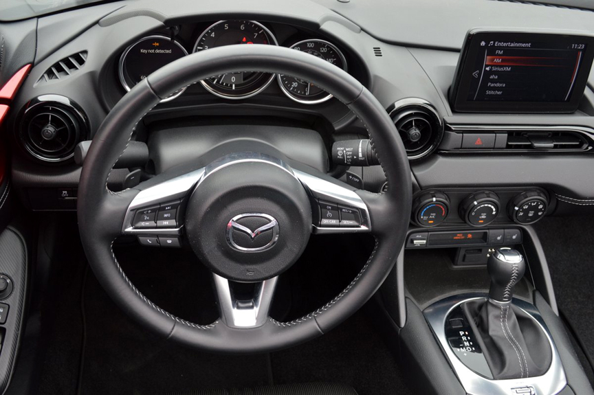 The Club RF eliminates the erection hassle and wind noise of the cloth roofed Miata convertible by substituting a multi-piece folding hardtop that takes just 14 seconds to drop or erect. When it's up, the cockpit becomes a quiet haven from the elements, with no perceptible wind noise penetrating the inner sanctum, even at 70 mph. Likewise, the automatic gearbox is a file and forget proposition. Just park the fat aluminum shift knob in the Drive slot and putter around town without giving gear selection a second thought. While it's true Mazda gives you the opportunity to be proactive about gear choice by providing a manual mode gate and paddles at the steering wheel, the Club RF seems happiest when left to its own shift program.