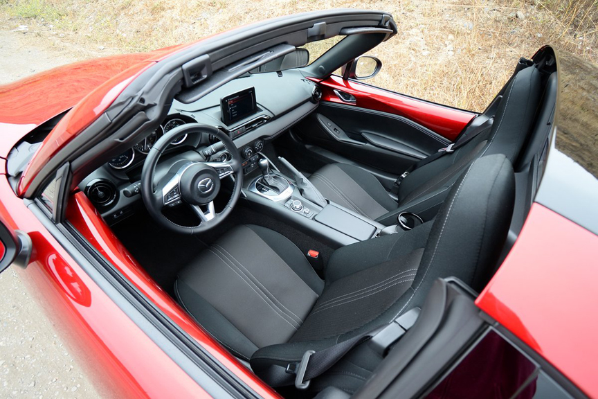 The Club package includes cloth seating surfaces which look a bit bargain basement compared to the rest of the interior. If we were ordering this Miata we would bump up our choice to the next echelon Grand Touring model, which not only adds leather seats, but also adaptable front LED lights which turn to illuminate curves. The price difference between the two models is just $780.
