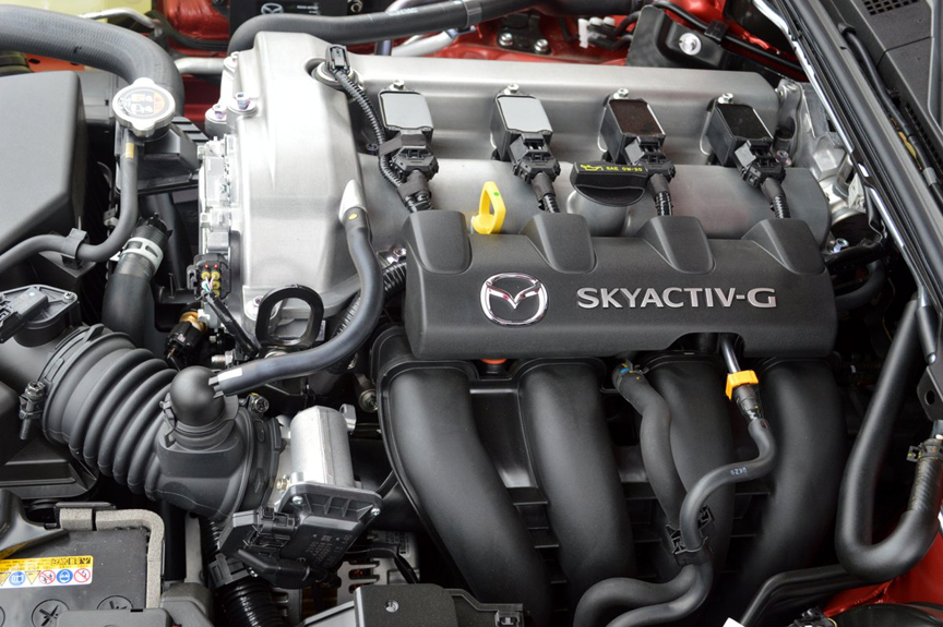 No matter which MX-5 you select, the same engine powers the entire model line. This gem of a motor is so attractively packaged that Mazda feels no need to cover its appearance with a plastic modesty shield. The Skyactive technology involved in producing 181hp from just 2.0 liters of displacement includes an alloy block and alloy head, a compression ratio of 13:1, and an under-square bore size of 83.5mm that is nearly 8mm smaller than the 91.2mm stroke length. Even with those revolution-limiting dimensions, the engine reaches its power peak at 7000rpm. The fact that it makes peak torque at just 4000rpm helps overall drive ability.