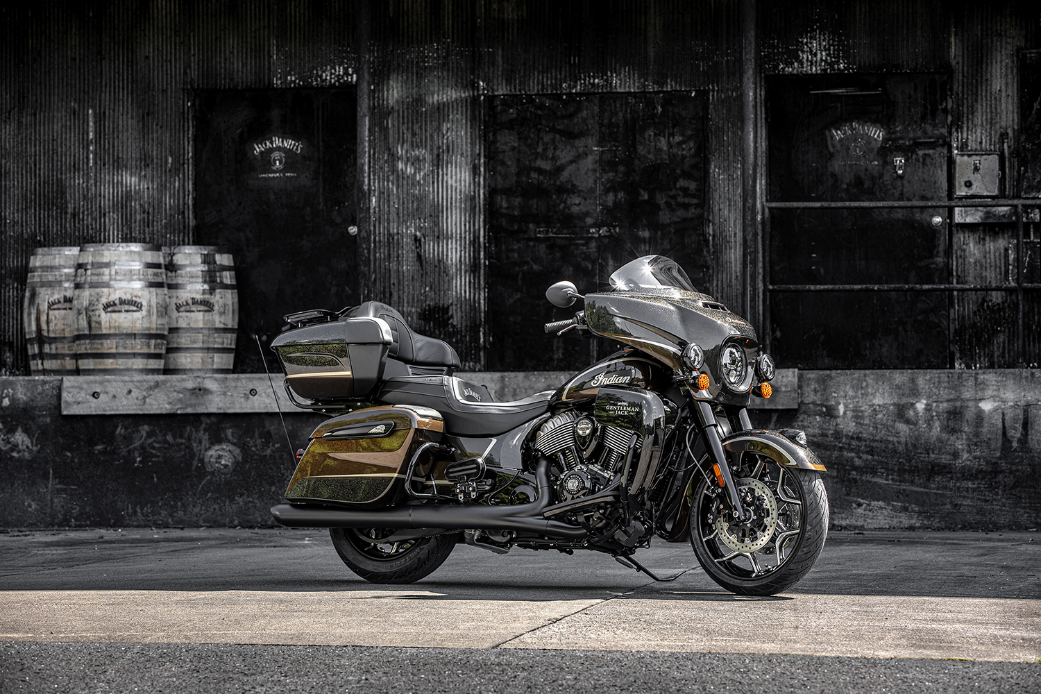 This year’s model was carefully designed to embody Jack Daniel’s® Gentleman Jack®, a premier example of the legendary whiskey maker’s meticulous crafting process. A nod to the brand’s original gentleman distiller, Gentleman Jack himself, this special whiskey is double-charcoal mellowed for an exceptionally smooth finish, perfect for celebrating life’s finest moments and the people we share them with. Gentleman Jack® is aged in handcrafted oak barrels, adding a strong but balanced oak flavor, topped off with subtle notes of caramel and vanilla. Out of consideration for the fine crafting process of Jack Daniel’s® Gentleman Jack® whiskey, the Jack Daniel’s® Limited Edition Indian Roadmaster Dark Horse carries many attributes that reflect the distillation and aging process, such as the bike’s custom Whiskey Pearl paint scheme and oakwood accents inspired by the rich and elongated Jack Daniel's® mellowing process.