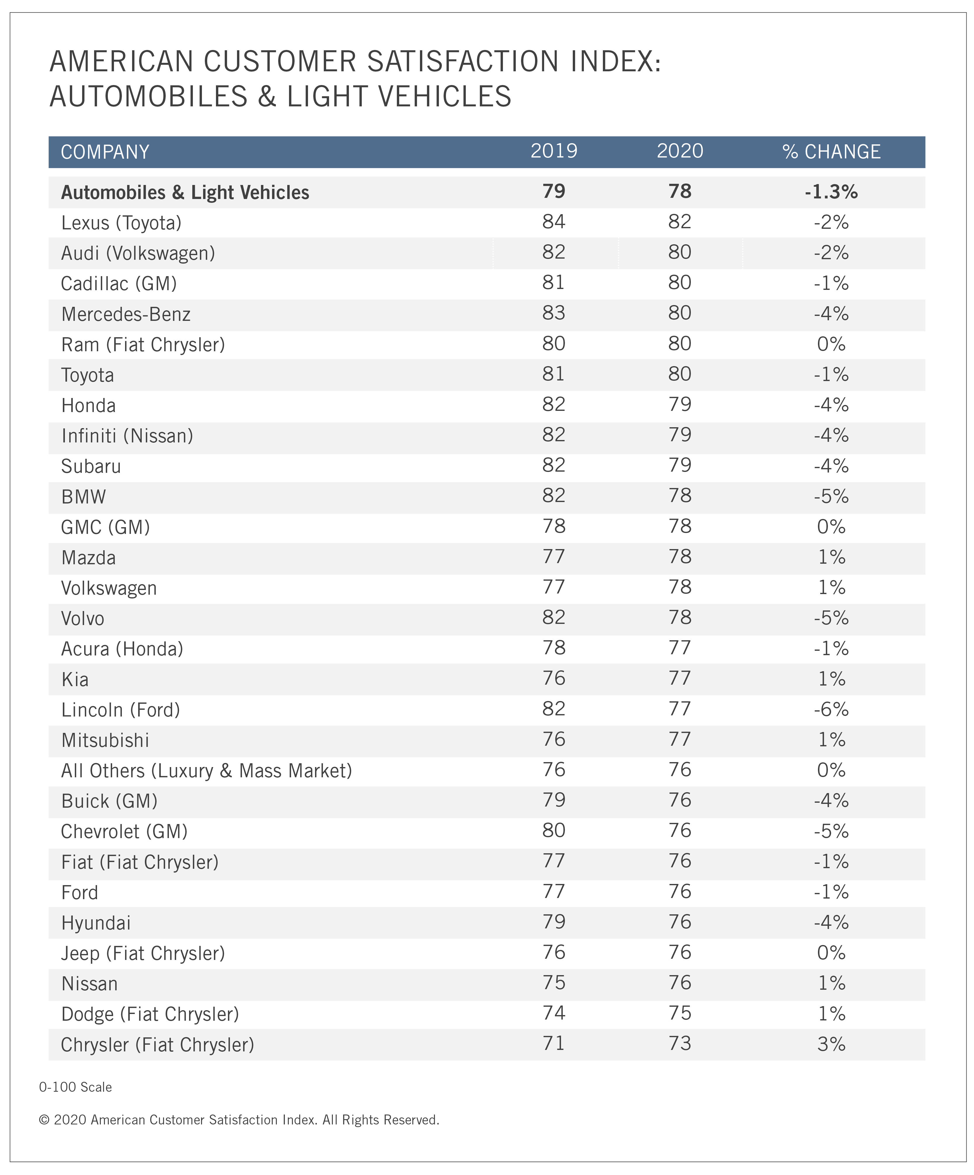 The ACSI Automobile Report 2019-2020 covering both domestic and foreign automobile nameplates is based on interviews with 10,414 customers, chosen at random and contacted via email between July 1, 2019, and June 14, 2020. Download the full report, and follow the ACSI on LinkedIn and Twitter at @theACSI.