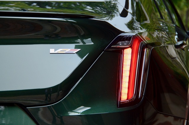 My drive experience in the CT4-V was in a sharply finished Evergreen Metallic AWD model. I think the CT4 looks good from any angle, but especially the front is quite stylish. The black trim on the V-series is much to my liking and helps to moderate the sloping rear roofline.