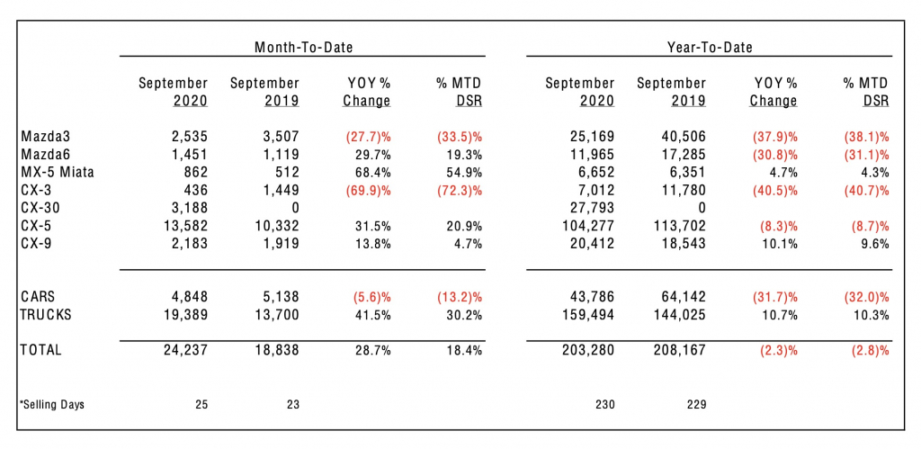 IRVINE, Calif. (Oct. 1, 2020) – Mazda North American Operations (MNAO) today reported total September sales of 24,237 vehicles, an increase of 28.7 percent compared to September 2019. Year-to-date sales totaled 203,280 vehicles; a decrease of 2.3 percent compared to the same time last year. With 25 selling days in September, compared to 23 the year prior, the company posted an increase of 18.4 percent on a Daily Selling Rate (DSR) basis.