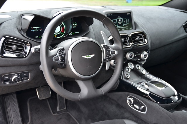 The Vantage design is both sensuous and brawny. You don’t see many of them on the road and it noticeably is a head turner by folk of all ages. Personally, I liked the view from the rear with the duck-tail shape and well styled taillights. The interior provides decent room for two. Alcantara trim evokes a number of pleasant emotions.