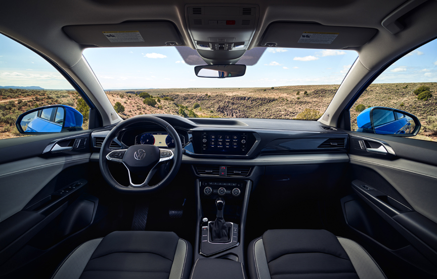 Inside, the Taos features modern design and premium fit and finish. The cockpit is composed of clean lines with a horizontal focus; dash décor divides the central touchscreen from climate controls and flows seamlessly into the door inserts, adding visual interest. Two-tone seats are standard—whether in the base cloth or optional leatherette and leather seating surfaces—and include a luxurious French Roast and black combination for top-of-the-line models. Standard comfort and convenience features include automatic headlights and push-button start; KESSY® keyless access is available, along with an 8-way power driver seat, dual-zone Climatronic® climate control, rain-sensing wipers, a heated leatherette steering wheel, heated and ventilated front seats, heated side mirrors and heated washer nozzles.