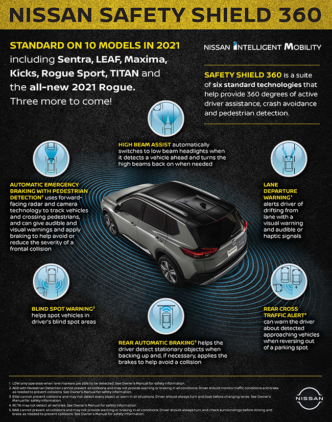 Nissan currently offers Safety Shield 360 standard on Sentra, LEAF, Maxima, Kicks, Rogue Sport and TITAN. Safety Shield 360 will also be standard on 2021 Rogue and on three additional models to be announced in the coming months. The all-new 2020 Sentra2 and 2021 Rogue3 both have the most standard safety features in their respective classes.