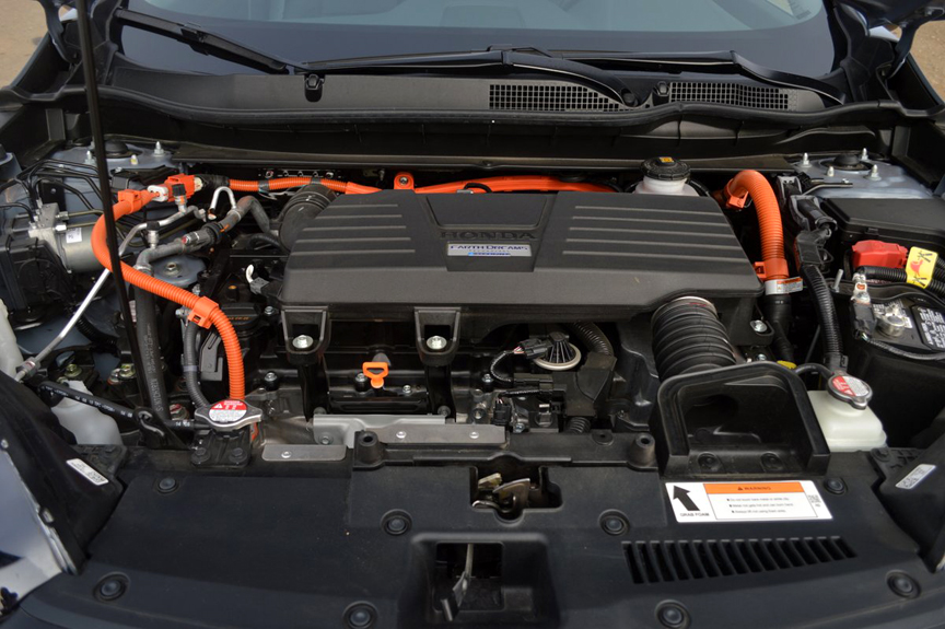 All Hybrid CR-Vs share the same power train, which consists of a VTEC, DOHC inline 4 cylinder gas engine (2.0 liters) augmented by an electric motor. Together, the two sources of power produce 212hp and 272lb.-ft. of torque. They feed this combined energy to all four wheels through a CVT transmission equipped with what Honda calls "Deceleration Paddle Selectors" to alter your rate of slowing. Unlike most sport equipped CVT units, these paddles do not allow you to accelerate more briskly as you manually downshift. Rather, the left hand paddle increases the rate of slowing while the right hand paddle decreases deceleration. A series of small chevrons illuminated in the instrument display monitor the rate of slowing.