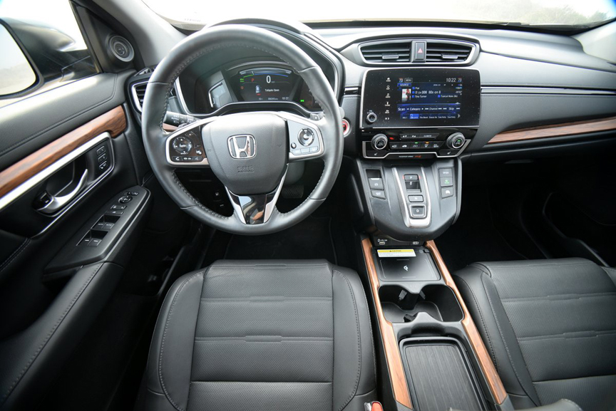 The Hybrid, toting some 3,450lbs. of curb weight, offers a modest power-to-weight ratio of 16.27lb/hp. Given the Hybrid's leisurely acceleration pace, the missed opportunity to "downshift" by paddle is regrettable. When you flatten the accelerator, the Hybrid CR-V emits an ethereal whine as it gains speed. Full acceleration is the only time you hear any noise at all from the drivetrain. The well insulated cabin of the CR-V remains luxuriously silent unless you tap into the standard premium audio system's 9 speaker sound machine. The interior layout of the Hybrid Touring has been upgraded for 2020 with some handy new features such as a wireless cell phone charging pad, a pair of easy access USB ports on the center console, a push button gear change first seen on Acura products, and multiple drive modes (Sport, Eco and EV).