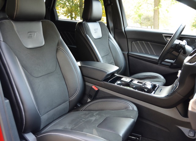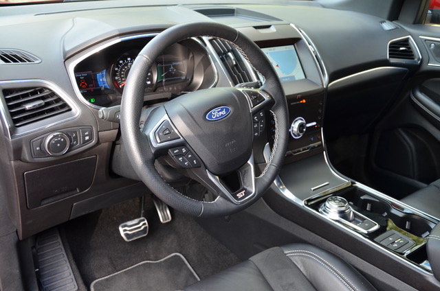 The Edge ST has larger front and rear stabilizer bars as well as ST-tuned front struts and rear monotube shocks. Brake rotors are also upped to 345 mm (13.6”). The ST-tuned sport suspension and steering systems can be further enhanced with an available ST Performance Brake Package, which was equipped on the ST I drove.
