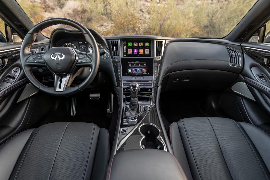 The performance pinnacle, the Q60 RED SPORT 400, spins the twin turbochargers up to 240,000 rpm to extract up to 400 horsepower and 350 pound-feet of torque from the VR-series 3.0-liter V-6. Regardless of output, the V-6 use a water-cooled intercooler to efficiently and quickly chill air entering the system for better throttle response and increased fuel economy.