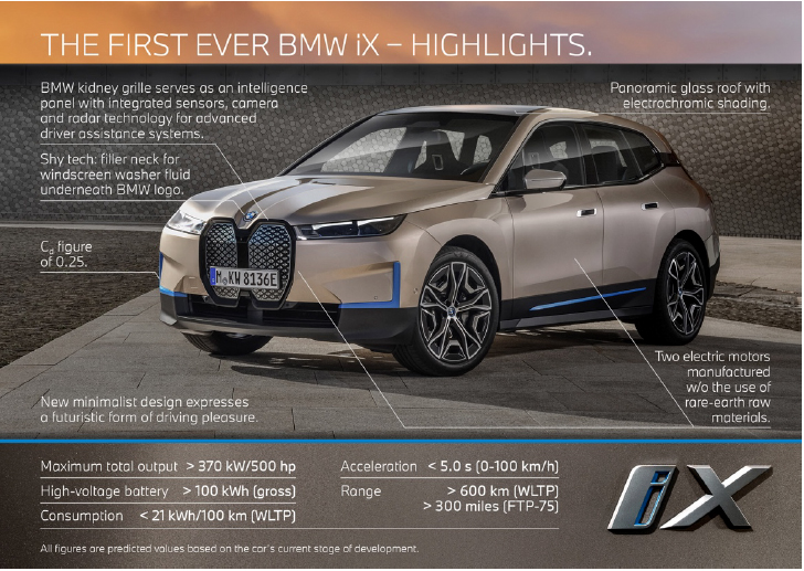• The fifth generation of BMW eDrive technology provides standout efficiency. Two electric motors with maximum output of more than 370 kW/500 hp power the BMW iX from 0 to 100 km/h (62 mph) in under 5.0 seconds. Combined electric power consumption of less than 21 kWh per 100 kilometers (62 miles) in the WLTP test cycle. High-voltage battery with gross energy content of more than 100 kWh ensures a range of over 600 kilometers in the WLTP cycle. That equates to more than 300 miles according to the EPA’s FTP-75 test procedure. (All figures are predicted values based on the car’s current stage of development.)