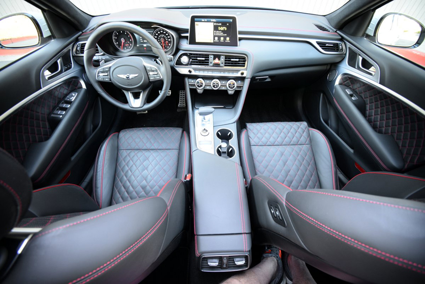 Though the handling of this Genesis plants it firmly in the sport sedan hall of fame, the éclair-sized sweet spot of the top line G70 covers far more than just quick motoring. This is an exceptionally comfortable ride. The supportive leather front seats are upholstered in a quilted pattern, with boxed red stitching that neatly matches the design of the door panels. These seats offer 16 modes of adjustment for the driver and 8 for the passenger. Both front seats also offer 4-way lumbar control. The dashboard is laid out with Aristotelian logic. All HVAC controls are clearly labeled and easy to operate. The programming system for the Infotainment Center is without question the easiest to program we have yet encountered. You will have your favorite channels installed in just seconds, while Mercedes, BMW and Audi owners will be driving to their dealerships for special training. Operational simplicity and efficiency is very much a part of the sweet spot syndrome, and the G70 RWD 3.3T has this course aced.