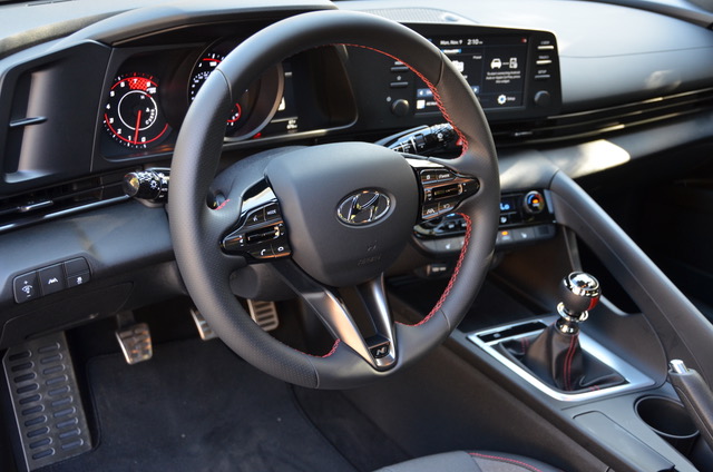 The cockpit gets a leather-wrapped steering wheel, sport seats with leather bolsters and N logos, red stitching accents, and a unique analog gauge cluster.