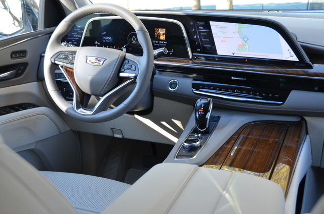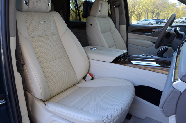 The Escalade is all about interior space and the big news is in the third-row seat. It’s roomier than previous and well suited for adults. The second-row seats are just as plush and comfortable, with a choice of a 3-seat bench or two captain’s chairs. Front seatbacks can hold entertainment screens for second-row viewing.