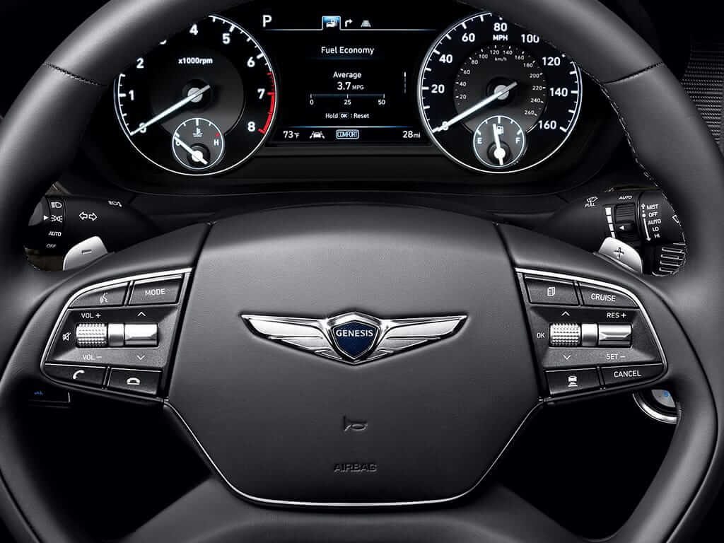 The interior is resplendant in high quality leather. The seats set a high mark for comfort and adjustability. Not only do the front seats have 22-way adjustability, but also and the rear seats pack eight-way functionality. To assist you and you passenger you can use the button on the door and a screen will pop up on the dash asking for your height, weight, and inseam. It then sets the seat up for the most comfortable experience. Meanwhile, the G90 adaptive dampers and five-link front and rear suspensions both smooth and cushion the ride, as well as reduces road noise.