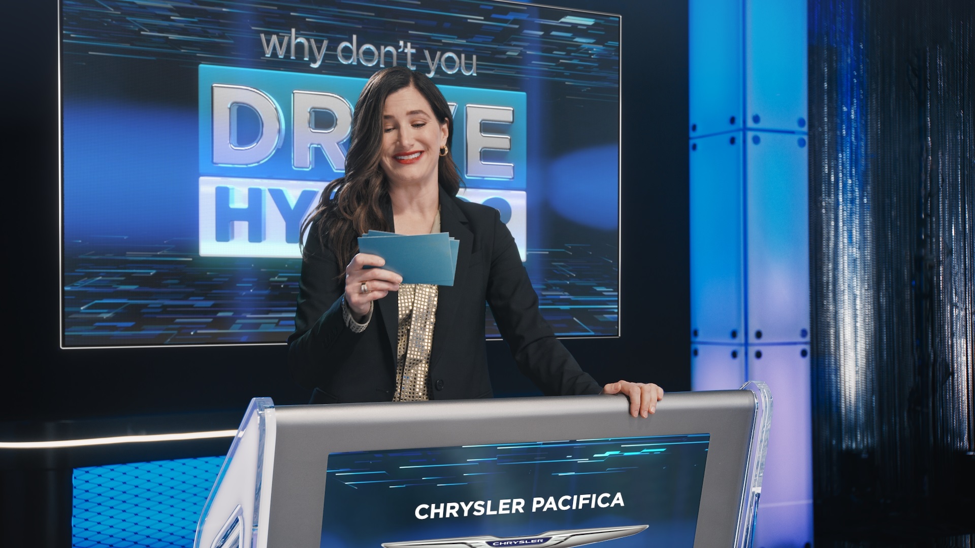 Auburn Hills, Mich. December 11, 2020; Chrysler brand and actress Kathryn Hahn ("Bad Moms," "We’re The Millers") team up once again for a new advertising campaign for the Chrysler Pacifica Hybrid. Spanning television, digital and social media, including Chrysler brand’s Facebook, Twitter and Instagram channels, the campaign “Drive a Hybrid” features Hahn as a disapproving game show host quizzing contestants on the merits of driving the Chrysler Pacifica Hybrid.