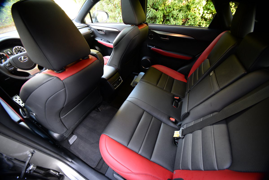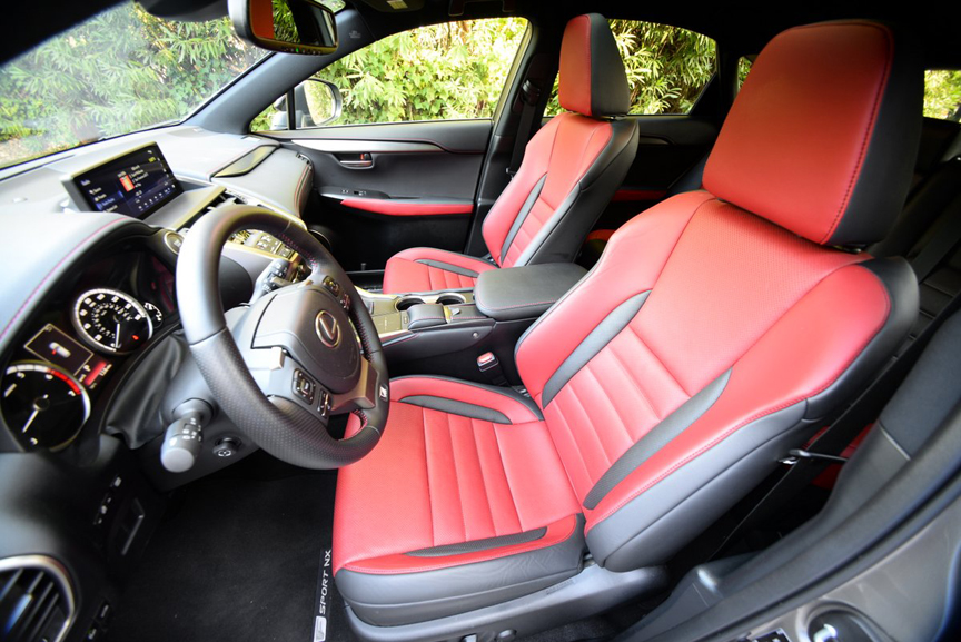 The high point of the NX 300 F Sport is its ultra luxurious interior treatment. The visual wizardry that went into fashioning the super supportive, red-piped, NuLuxe F Sport seats, matching door panels, carpeting, and all black headliner distinguish this version from all lesser models. You can feel your pulse quicken just a tad every time you climb into this diminutive Lexus. The precision of the driving experience is commensurate with the optics. Steering feedback is excellent, all six gears offer well chosen ratios, and the F Sport's aluminum pedals are a cinch to operate thanks to embedded rubber tread ribs. But best of all, the F Sport is competently equipped to handle challenging paved terrain. Lexus has orchestrated a number of significant suspension modifications here: recalibrated, sport-tuned spring, shock and anti-roll bar rates, plus 7.5 x 18J aluminum F Sport wheels. Our test NX was also equipped with Adaptive Variable Suspension, a bargain at $770 because it automatically softens ride quality over potholes and poor pavement.