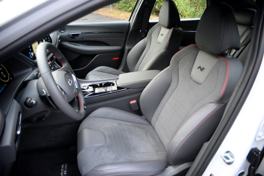 This is inarguably a great looking car. From any viewing angle, the N Line transformation improves on the already handsome Sonata. The list of visual improvements is short but effective. Black keynotes the N Line's understated good looks. The expansive front grill seems less obtrusive in piano black, as do the side mirrors mounted on black A pillars. N Line specific front and rear fascia panels distinguish this Hyundai from other Sonatas. Polygonal dual exhaust outlets are cleanly integrated into the lower rear diffuser panel. The exterior makeover is completed with a set of N Line 19 inch honeycomb alloy rims which mount more rubber (245/40R19 Continental Premium Contact 6) than any other Sonata. The special treatment continues when you swing open the driver's door. The aluminum pedal cluster immediately catches your eye, along with the leather wrapped steering wheel with an "N" designation branded on its face. The special motif continues with Dinamica Suede front sport seats fitted with racing grade leather side bolsters. Red stitching and piping makes the seats pop visually, along with subtly embossed "N" designations on the headrests.
