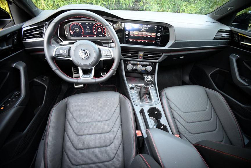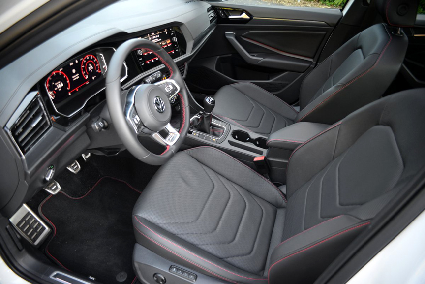 Aside from that shortcoming, the GLI was a blast to drive on back roads. In particular, we loved the responsiveness of the shock valving as it adapted to multiple pavement puzzles with brisk equanimity. Playing an equally important role in the well snubbed grip of this Jetta were the quartet of super adhesive Hankook Ventus Evo S1 radials (225/45R18) which put their TW 340 rating to good use in helping the GLI generate substantial lateral grip in challenging circumstances. Best of all, the Autobahn comes to you with a standard 6-speed manual gearbox that raises the backroad driving experience from good to great. Each time you select a gear, its number is prominently displayed on the instrument panel, so you're never in doubt about where you stand with this transmission. The manual also includes a hill holder feature which prevents backsliding on hill starts, and a very smooth clutch engagement protocol. VW also offers an optional 7-speed Tiptronic automatic.