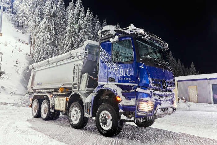 At the end of 2020, work began on the ten-kilometre Nordic ski trail, which had to be six metres wide at the end and have a snow covering at least 60 centimetres thick. For ten days, the Mercedes-Benz Arocs tippers drove the white snow to the site. In the middle of January, the snow shortage was reversed: it snowed so much that the trucks had to take almost a hundred truckloads of fresh snow out of the arena, the TV area and also out of the areas for the athletes and their support staff. Sometimes the driving could only be done using snow chains.