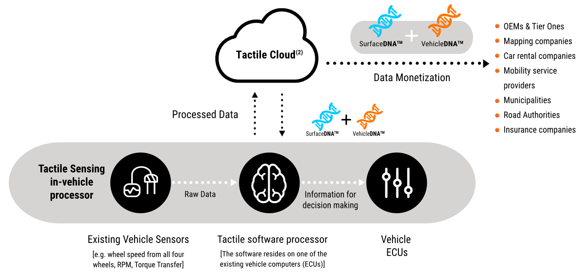 The company utilizes vehicles’ existing built-in sensors (wheel speed, wheel angle, RPM, brake pedal position, etc.) to create actionable insights regarding the roads as well as the vehicle-road dynamics. Vehicles embedded with Tactile Mobility’s technology collect and analyze vital road condition data which is transformed into SurfaceDNA™ in the cloud. SurfaceDNA™ models road features such as grades, banks, curves, normalized grip levels, and the location of distresses such as bumps, cracks, and potholes.