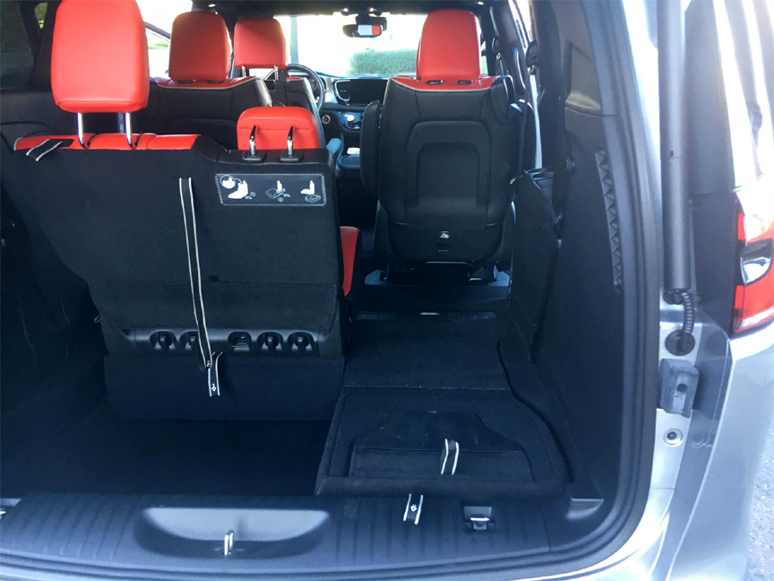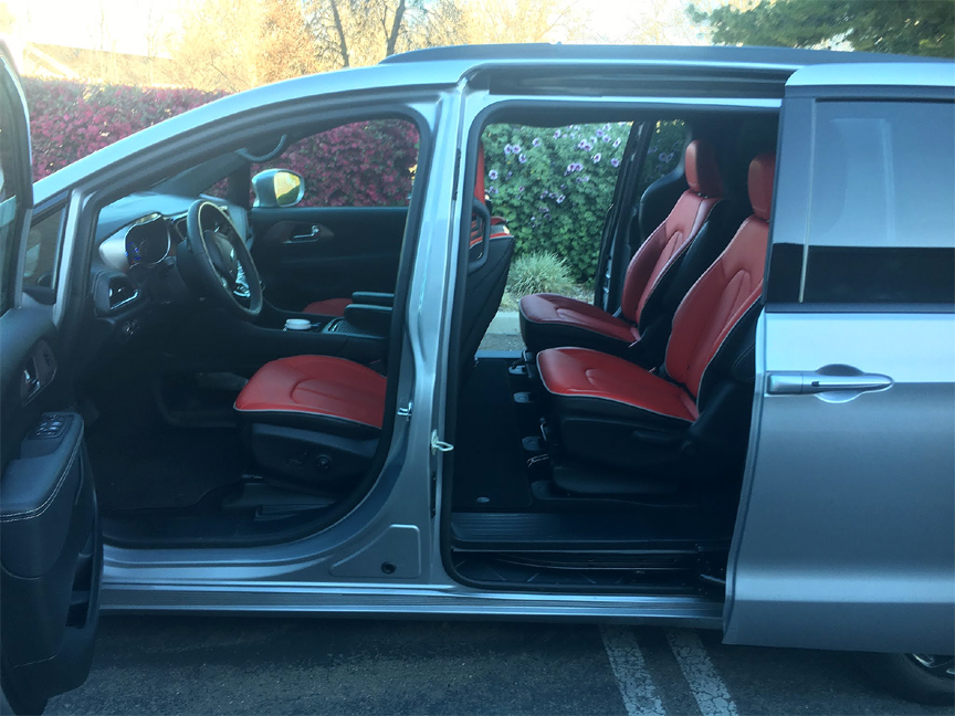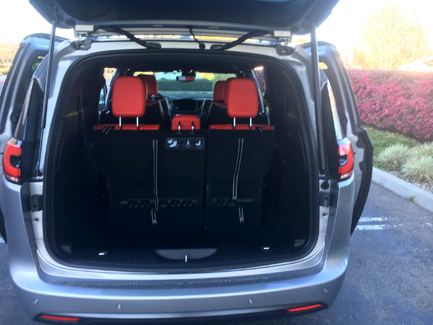 Ignoring the seat color (not easy to do) I found the interior very comfortable and accommodating. There are two very comfortable, 8-way power adjusted, heated and cooled, front seats; two center bucket seats, and a split-bench rear seat. The center and rear seats are Chrysler's 'Stow N Go' and fold flat giving a huge cargo area of 140.5 cubic feet behind the front seats.