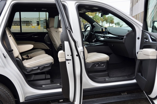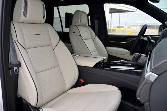 The Escalade is all about interior space and the big news is in the third-row seat. It’s roomier than previous and well suited for adults. The second-row seats are just as plush and comfortable, with a choice of a 3-seat bench or two captain’s chairs. Front seatbacks can hold entertainment screens for second-row viewing.