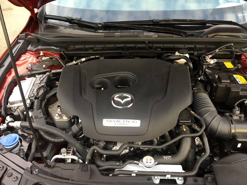 Under the hood is the 2.5-liter, SKYACTIVE-G Turbo, four-cylinder that puts out up to 250 hp. I say up to because the output is dependent on the octane rating of the gasoline you use. The max horsepower is with 93 octane, the lowest horsepower rating is 227 with regular fuel.