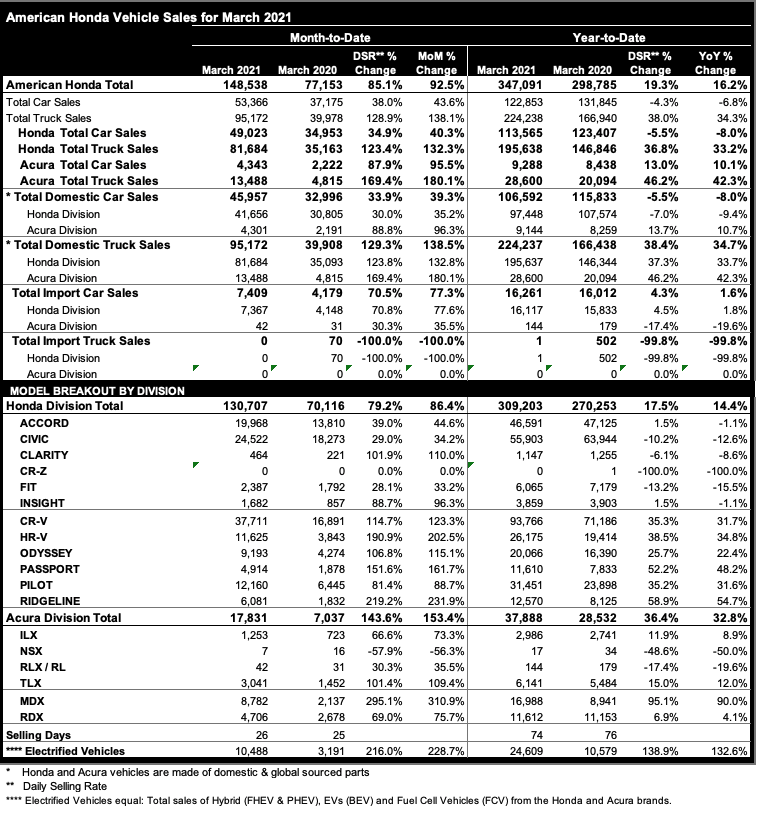 - American Honda sets new March record for total vehicle sales, pushing Q1 up 16% over 2020