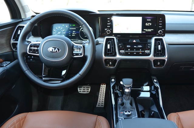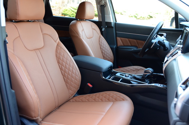 Design and styling being subjective, I was pleased with the overall looks of the new Sorento. I’m not a green car person but the dark overall appearance of the X-Line was to my liking. I also liked the rust-colored seat and door trim that brightened the interior, harmonized well with the wood trim and provided a luxury look. There was a rich look to the Sorento drove.
