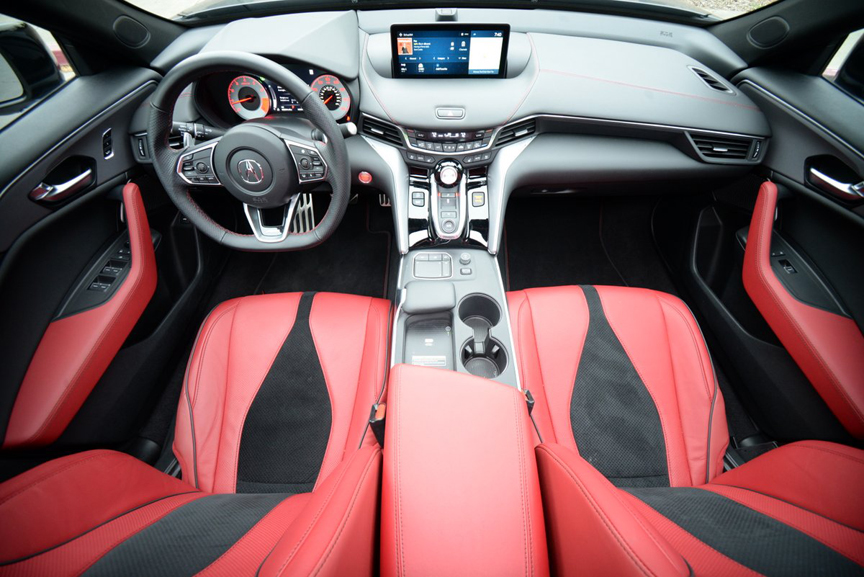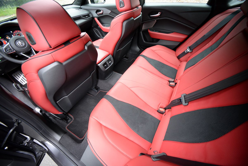 In contrast to the restrained appearance of the exterior, the flashy interior visually pops your eyeballs, with ebony seats bisected by broad bands of crimson striping. My wife thought the contrast was a bit much but I rather enjoyed the audacity. In any event, the A-Spec's black leather-trimmed sport seats benefit in comfort and support from the red UltraSuede inserts. Both driver and passenger front seats are 12-way adjustable, and feature a valet style slide to ease entry and exit. Although the new TLX has grown by 5 inches in overall length compared to its predecessor, the growth in wheelbase is just 4 inches. But that extra 4 inch pickup makes for happier back seat travel time for passengers. The rear bench seat echoes the bravura cosmetic trim of the front seats.